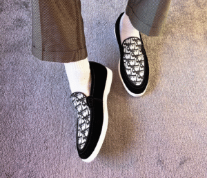 Description: Redefine your casual rotation with a masterpiece of understated luxury. These slip-ons bridge the gap between street-ready comfort and high-fashion silhouette. Featuring a striking, graphic-print canvas upper framed by deep, velvety black suede, they offer a tactile experience that looks as good as it feels. Finished with a pristine white rubber sole and a rich tan leather interior, this is footwear for those who appreciate the finer details.